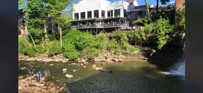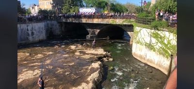The race route: Starting in the river in Riverside Park, under the bridge, over the falls to the finish line.